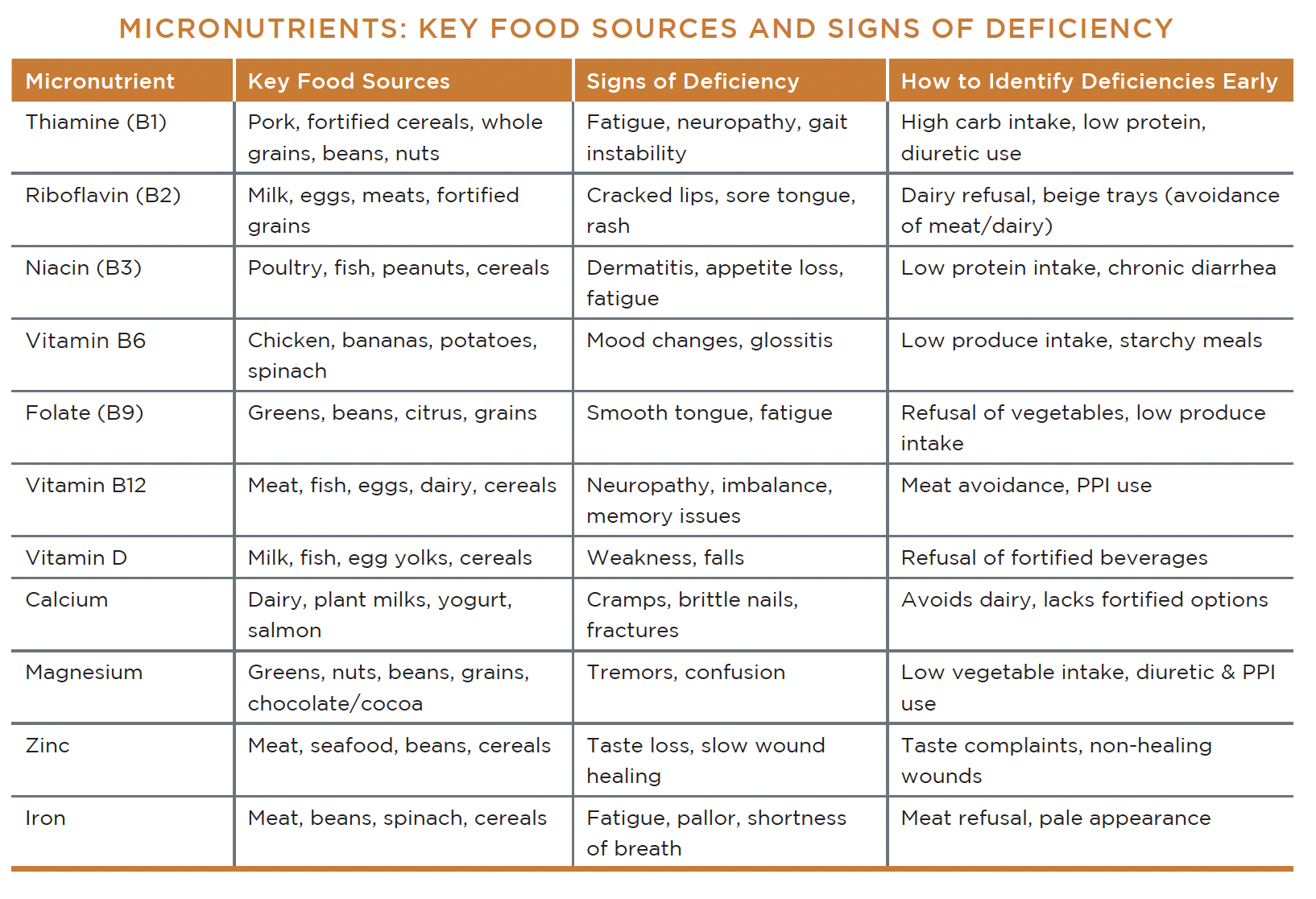 Micronutrient deficiencies often develop gradually and can be mistaken as normal signs of aging. CDM, CFPPs play a crucial role in identifying early changes in appetite, mood, mobility, and intake patterns. In Mrs. Jones’s case, her fatigue, gait instability, and meal refusal patterns suggested possible deficiencies in thiamine, vitamin B12, and iron. By reporting these concerns promptly, the dietitian was able to evaluate her needs, recommend appropriate fortified foods, and coordinate supplementation with the care team. Within weeks, her energy and engagement improved. This demonstrates how early detection and strong collaboration with the entire care team can reverse decline and significantly improve resident well-being. Numerous micronutrient deficiencies are common and can exist at once. CDM, CFPPs can play an important role in residents’ nutritional care by identifying risk factors and communicating with the care team.